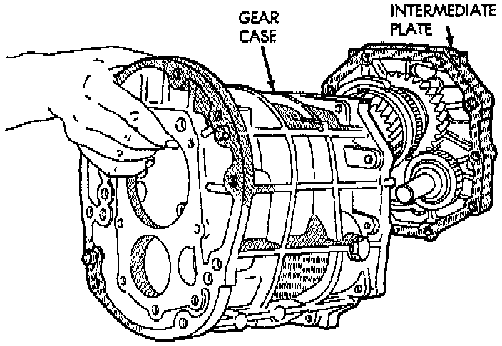 3. Align gear-train and shift rails with mating holes in transmission case and install transmission case to the intermediate plate. Verify that the transmission case is seated on the intermediate plate locating pins.