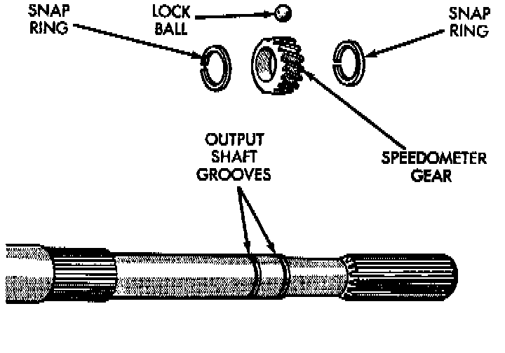 8. Install speedometer gear lock ball in output shaft and install speedometer gear onto output shaft.