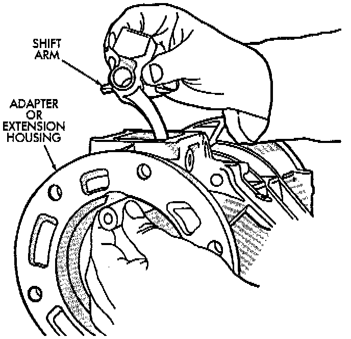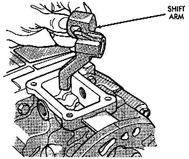 13. Start shifter arm shaft in hole in back of transmission case. Align shift arm and shifter arm shaft and insert shifter arm shaft through the shifter arm and into the forward portion of the transmission case.