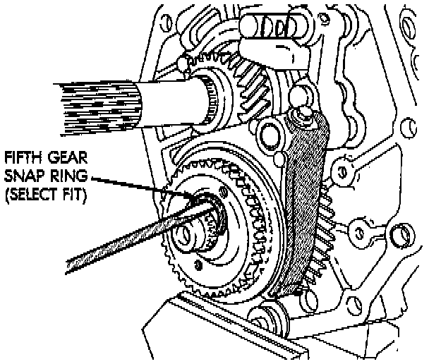 3. Remove select fit snap ring that secures fifth spline gear and counter fifth gear on shaft.