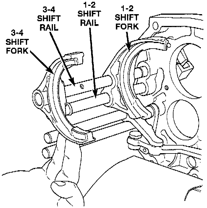 18. Install the 1-2 shift fork onto the 1-2 and 3-4 shift rails.