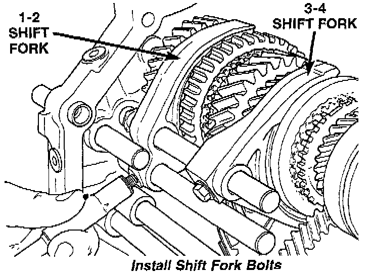 27. Install new bolts to hold the shift forks to the shift rails.