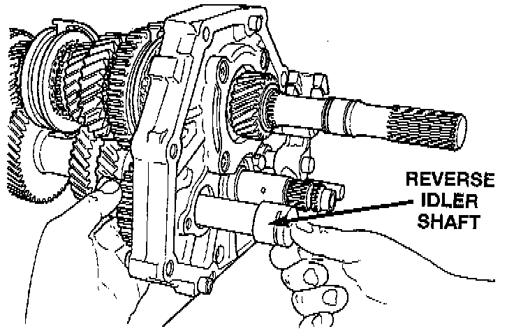 31. Install the reverse idler shaft through the intermediate plate and reverse idler gear. Make sure that the notched cut-out in the idler shaft is to the rear of the transmission.