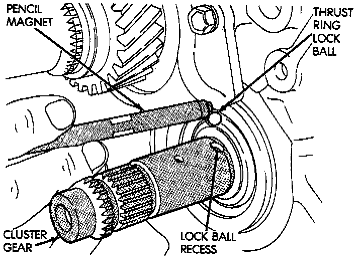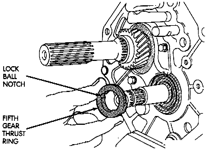 35. Install the fifth gear thrust ring onto the countershaft and over the lock ball.
