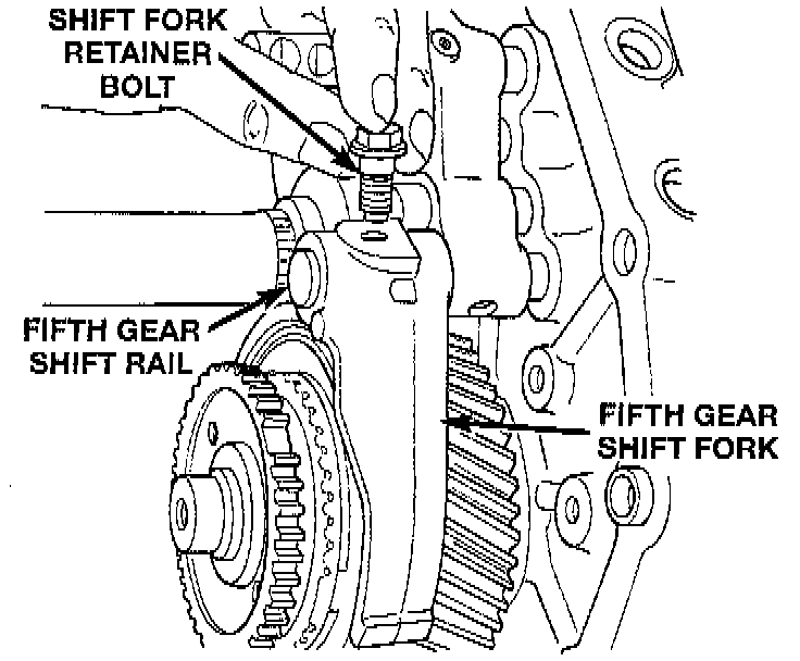 42. Install new bolt to hold fifth gear shift fork to the fifth gear shift rail.