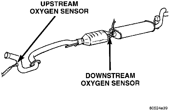 The upstream O2S sensor is located in the exhaust downpipe. The downstream sensor is located near outlet end of catalytic converter (Fig. 42).