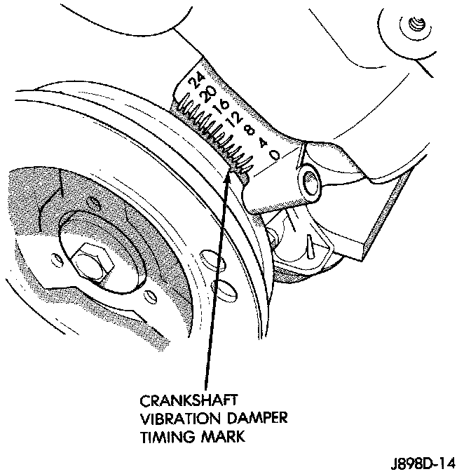 7. Slowly continue to rotate the engine. Do this until the timing index mark on the vibration damper pulley aligns with the top dead center (TDC) mark (0 degree) on timing degree scale (Fig. 37). Always rotate the engine in direction of normal rotation. Do not rotate the engine backward to align the timing marks.