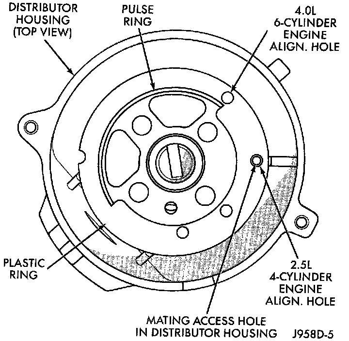 6. Four different alignment holes are provided on the plastic ring (Fig. 40). Note that 2.5L and 4.0L engines have different alignment holes.