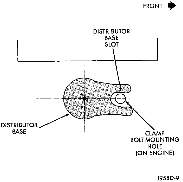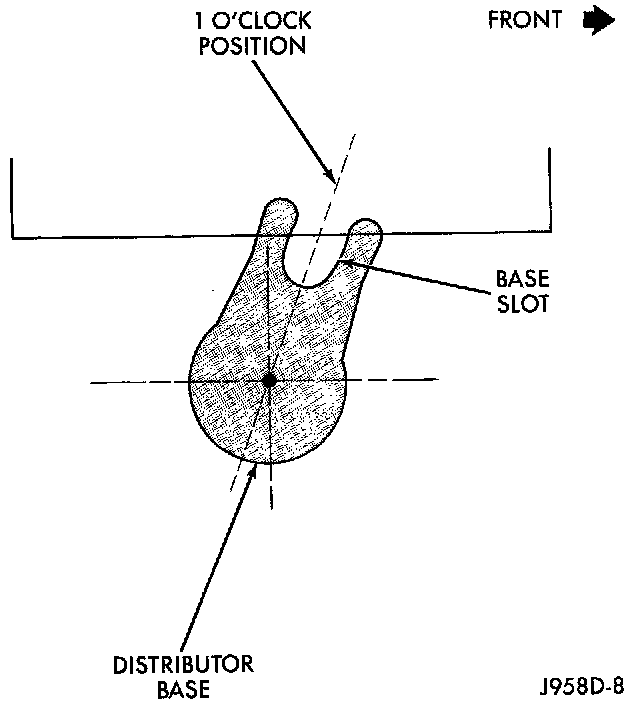 ^ The centerline of the slot at the base of the distributor is aligned to the centerline of the distributor holddown bolt hole on the engine. In this position, the holddown bolt should easily pass through the slot and into the engine.