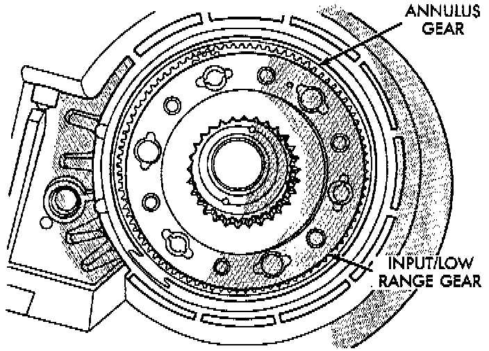 1. Align and install low range/input gear assembly in front case. Be sure low range gear pinions are engaged in annulus gear and that input gear shaft is fully seated in front bearing.
