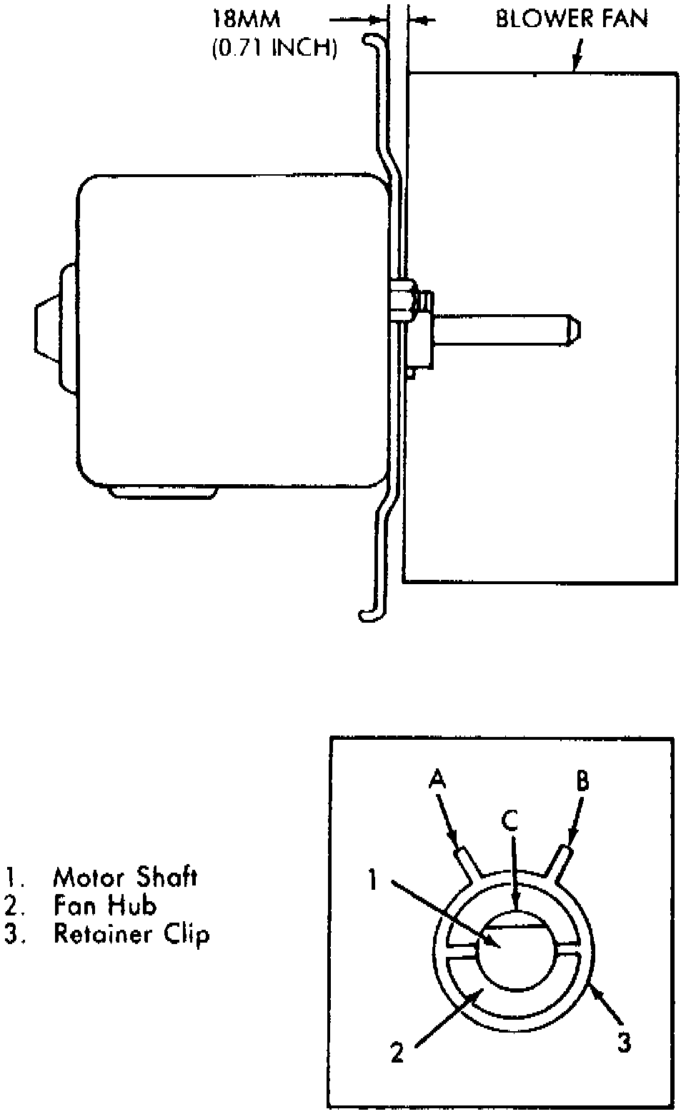 (5) Remove the blower motor fan from the motor shaft for access to the motor attaching nuts (Fig. 11). To install the blower fan and motor, reverse the removal procedures. The ears (A) and (B) of the retainer clip must be over the flat surface on the motor shaft (Fig. 11).