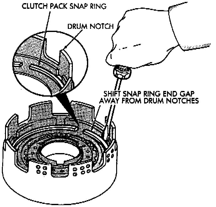 7. Check snap ring position. If necessary, shift snap ring until end gap is not aligned with any notches in clutch drum.