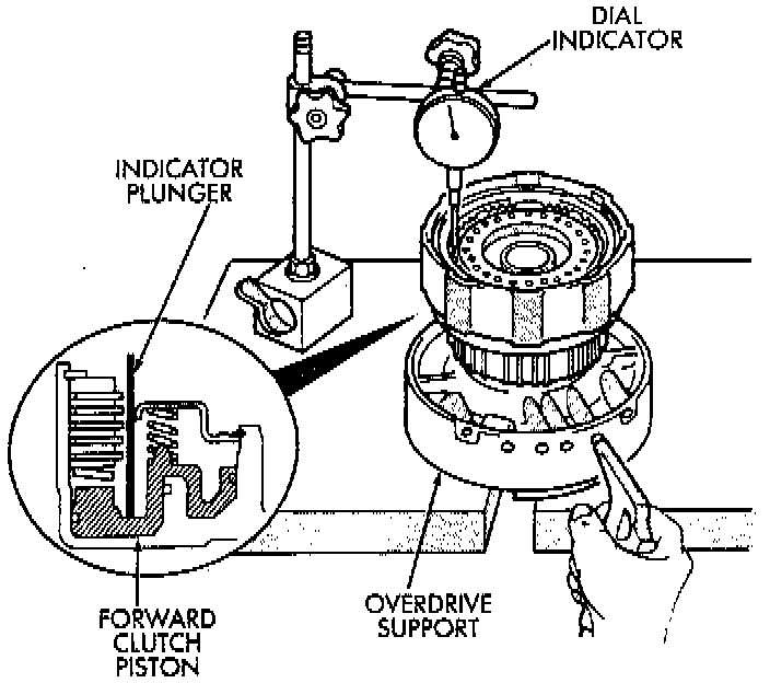 4. Mount dial indicator on clutch drum. Position dial indicator plunger against clutch piston.