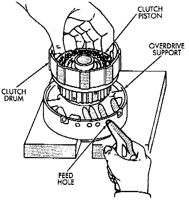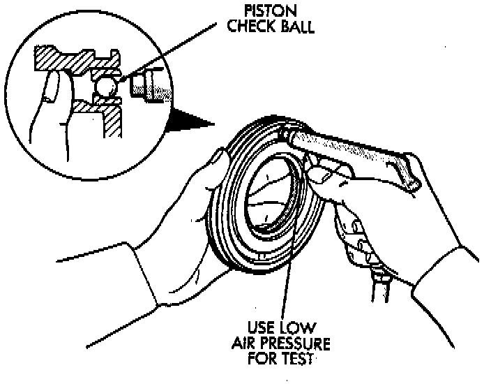 20. Inspect clutch piston check ball. Ball should move freely within piston. Check ball seating by applying low pressure compressed air to ball feed hole. Ball should seat firmly and not leak air.