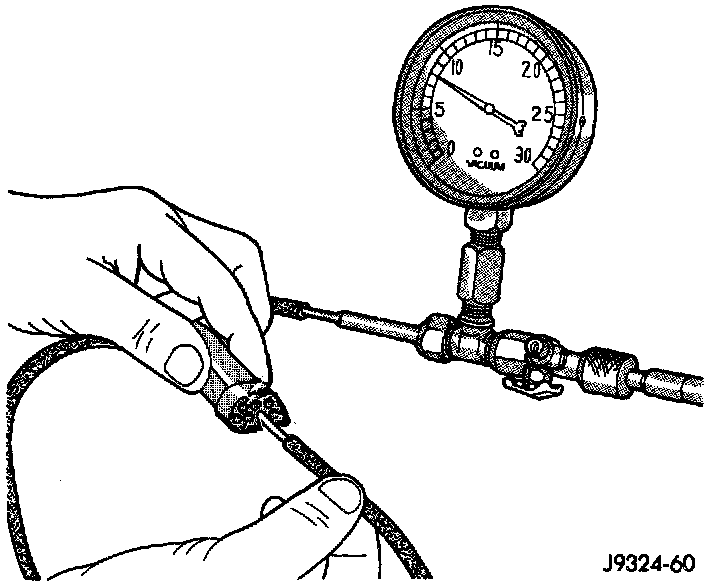 6. To locate a leak in a vacuum line, leave one end of the line plugged and connect the test set hose or probe to the other end. Run your fingers slowly along the line while watching the test set gauge. The vacuum reading will fluctuate when your fingers contact the source of the leak. To repair the vacuum line, cut out the leaking section of the line. Then, insert the loose ends of the line into a suitable length of 3-mm (1/8-inch) inside diameter rubber hose.