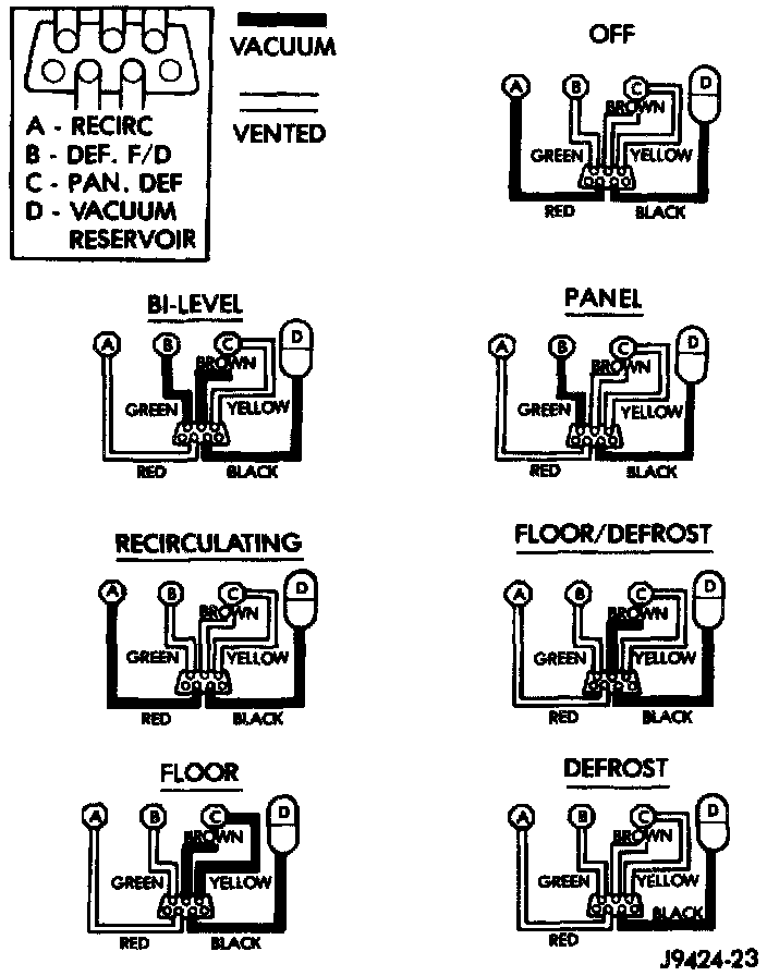 2. Connect the test set vacuum hose probe to each port in the vacuum harness connector, one at a time, and pause after each connection. The test set gauge should return to the 27 kPa (8 in. Hg.) setting shortly after each connection is made. If OK, replace the faulty mode control switch. If not OK, go to Step 3.