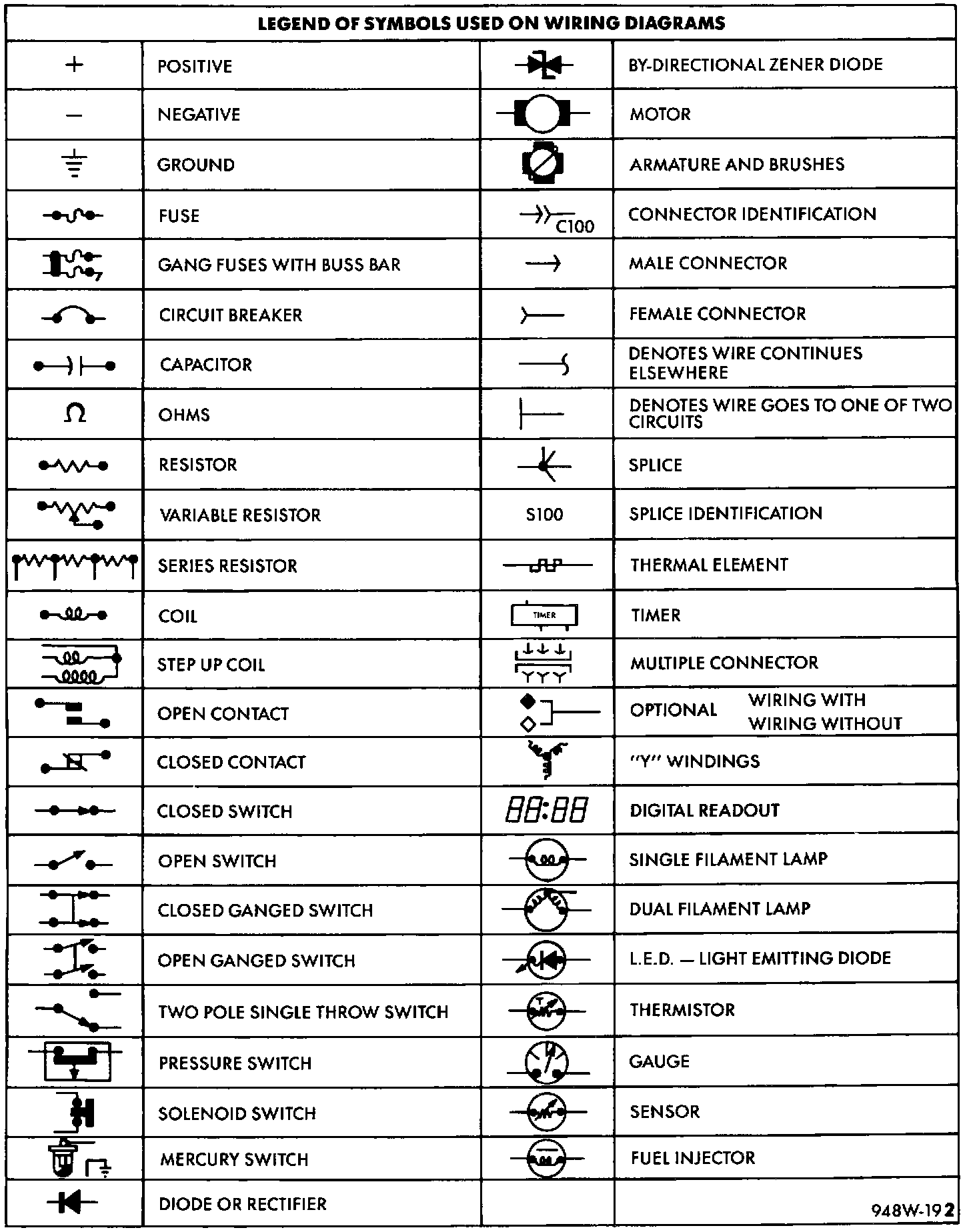 Various symbols are used throughout the Wiring Diagrams section. These symbols can be identified by referring to the Symbol Identification chart.