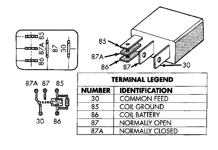 1. A relay in the de-energized position should have continuity between terminals 87A and 30, and no continuity between terminals 87 and 30. If OK, go to Step 2. If not OK, replace the faulty relay.