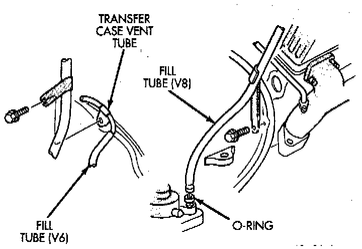 9. Remove fill tube bracket bolts and pull tube out of transmission. Retain fill tube O-ring. It will also be necessary to remove bolt attaching transfer case vent tube to converter housing.