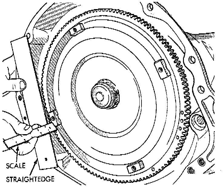 6. Check converter seating with steel scale and straightedge. Surface of converter lugs should be 1/2 inch to rear of straightedge when converter is fully seated.