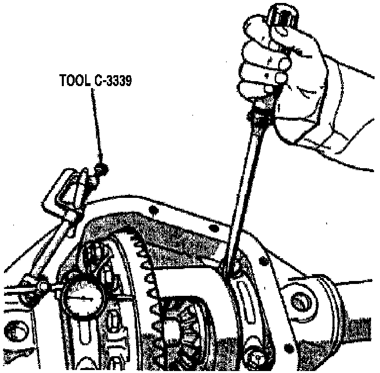 4. Push ring gear away from pinion as far as possible, then record dial indicator reading. Repeat steps 3 and 4 several times until same reading is obtained each time.