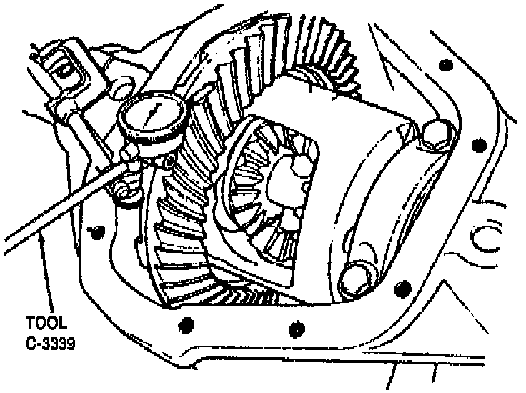 2. Mount suitable dial indicator on housing with plunger bearing against back of ring gear.