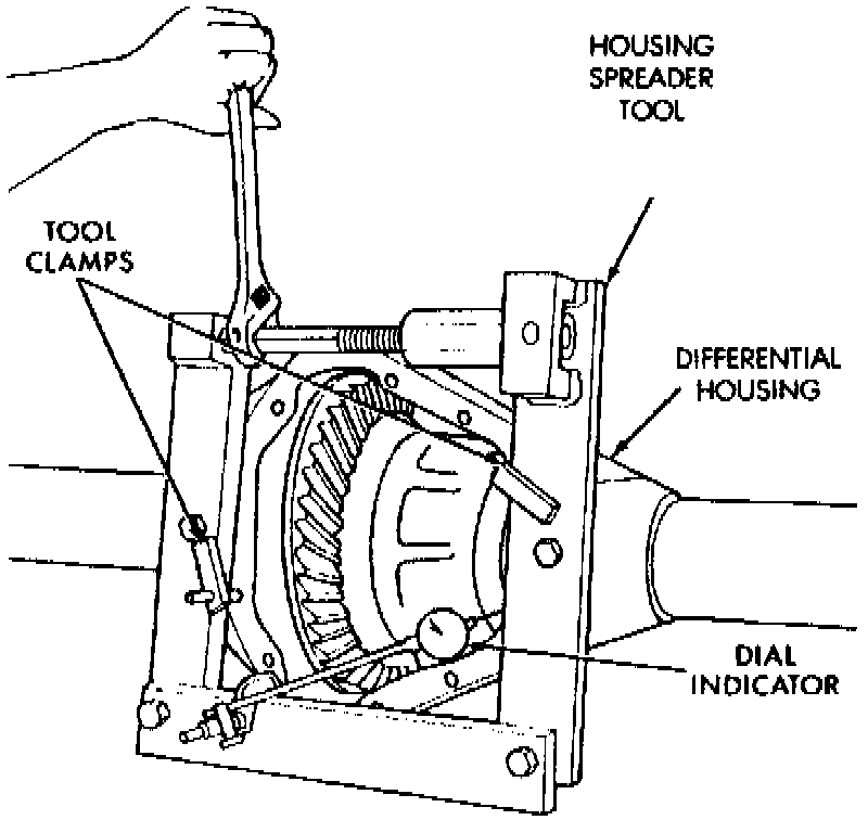 7. Zero dial indicator, then rotate spreader screw to spread housing 0.015 inch. Do not spread housing more than 0.015 inch, as housing may become permanently distorted.