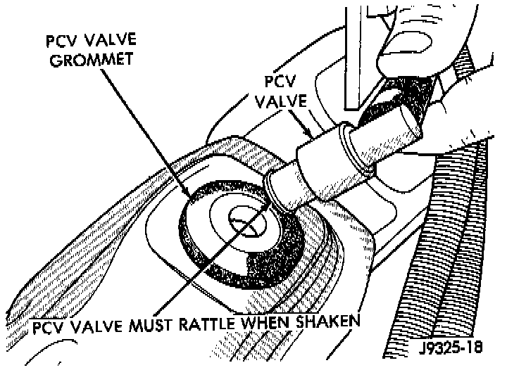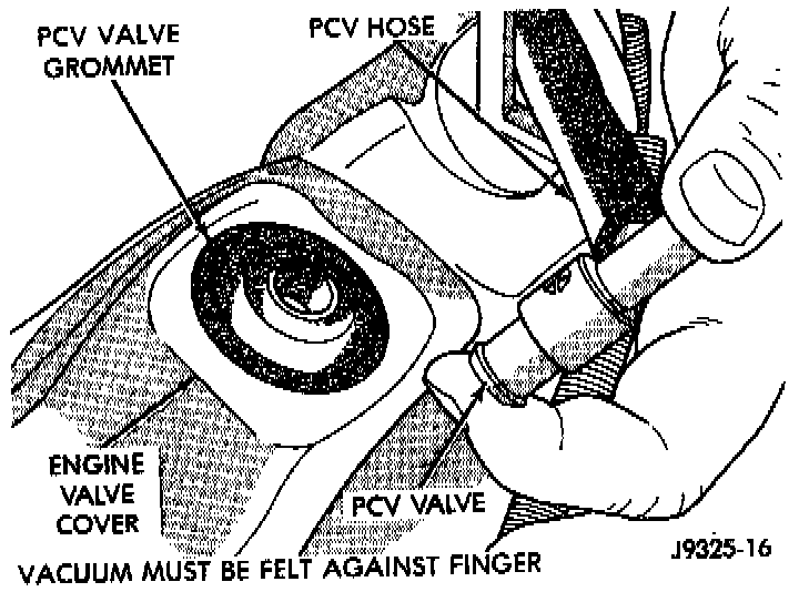 1. With engine idling, remove the Positive Crankcase Ventilation (PCV) valve from cylinder head (valve) cover. If the valve is not plugged, a hissing noise will be heard as air passes through the valve. Also, a strong vacuum should be felt at the valve inlet.