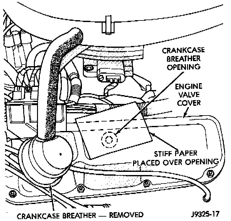 2. Install the PCV valve. Remove the crankcase breather/filter. Hold a piece of stiff paper, such as a parts tag, loosely over the opening of crankcase breather/filter at the cylinder head (valve) cover.