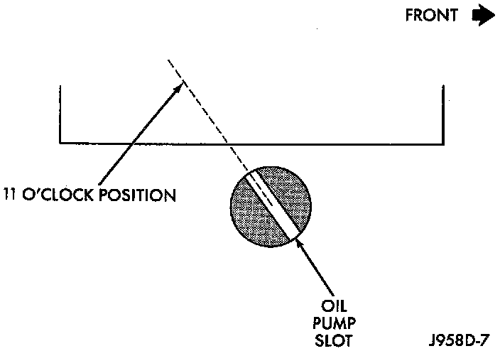 14. Observe slot in oil pump gear through hole on side of engine. It should be slightly before (counterclockwise of) 11 o'clock position.