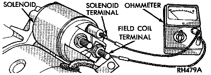 2. Check for continuity between the solenoid terminal and the field coil terminal with a continuity tester. There should be continuity. If OK, go to Step 3. If not OK, replace the faulty starter assembly.