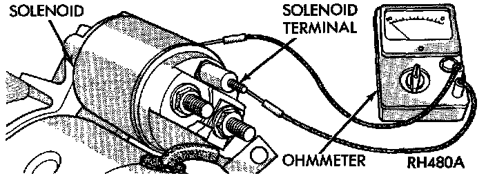 3. Check for continuity between the solenoid terminal and the solenoid case. There should be continuity. If OK, go to Step 4. If not OK, replace the faulty starter assembly.
