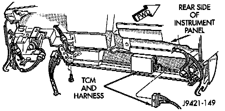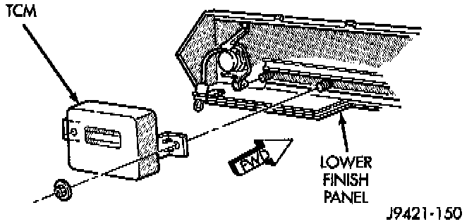 The transmission control module is mounted under the instrument panel. On left hand drive models, it is at the driver side of the lower finish panel. On right hand drive models, it is at the passenger side of the lower finish panel.