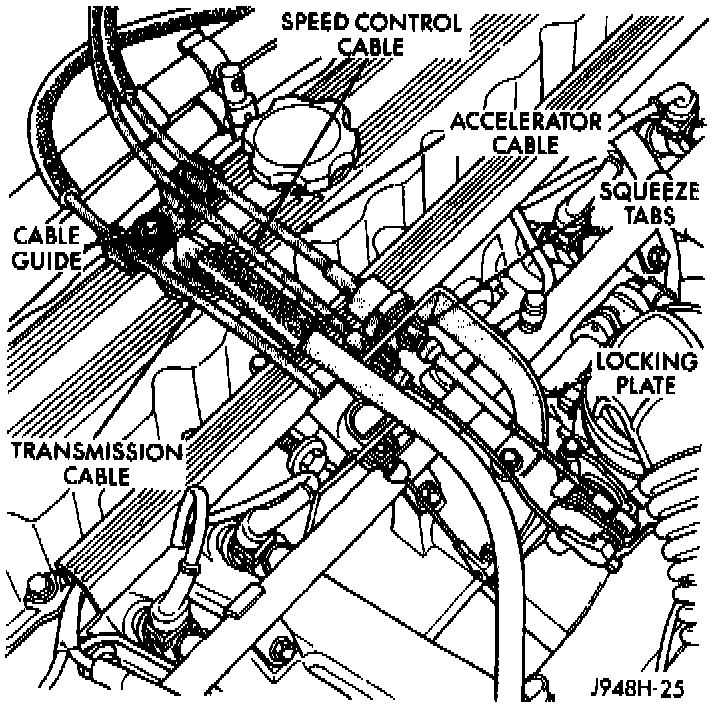 3. Two squeeze tabs are located on sides of speed control cable at cable locking plate. Squeeze the tabs together and push cable out of cable locking plate.