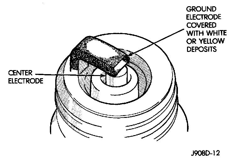 Fuel scavenger deposits may be either white or yellow. They may appear to be harmful, but this is a normal condition caused by chemical additives in certain fuels. These additives are designed to change the chemical nature of deposits and decrease spark plug misfire tendencies. Notice that accumulation on the ground electrode and shell area may be heavy, but the deposits are easily removed. Spark plugs with scavenger deposits can be considered normal in condition and can be cleaned using standard procedures.