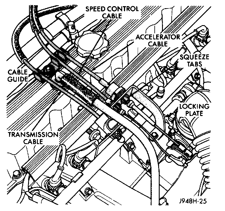 3. Two squeeze tabs are located on sides of speed control cable at cable locking plate. Squeeze the tabs together and push cable out of cable locking plate.