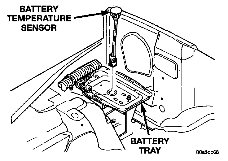 The battery temperature sensor is located under the vehicle battery and is attached to a mounting hole on battery tray.