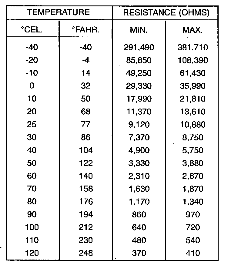 2. Test the resistance of sensor with a high input impedance (digital) volt-ohmmeter. Refer to SENSOR RESISTANCE (OHMS)-COOLANT TEMPERATURE SENSOR(INTAKE AIR TEMPERATURE SENSOR chart. The resistance (as measured across sensor terminals) should be within range shown in chart. If not, replace sensor.