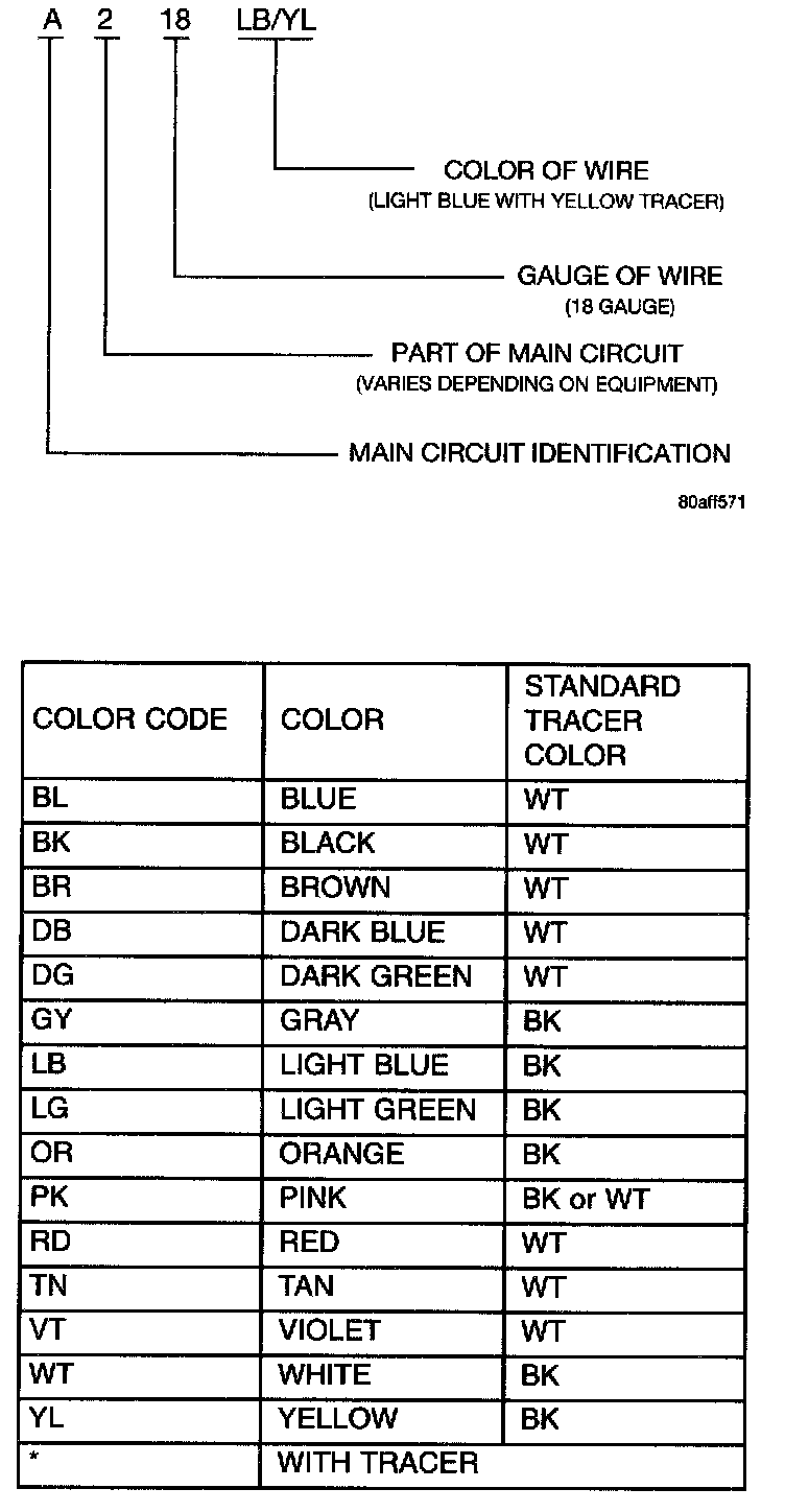Each wire shown in the diagrams contains a code which identifies the main circuit, part of the main circuit, gage of wire, and color