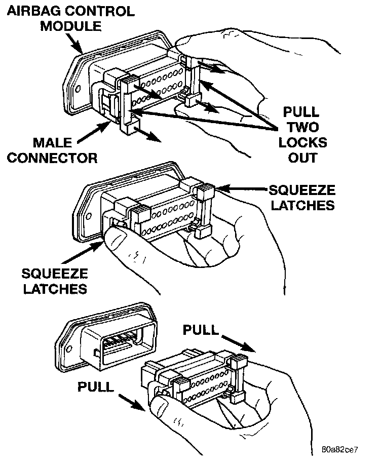 b. Squeeze the two connector latch tabs between the thumb and forefinger and pull the connector straight away from the ACM connector receptacle.