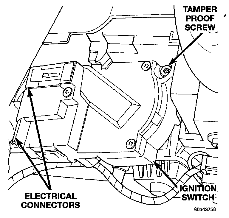 3. Remove ignition switch mounting screw. Use tamper proof torx bit (Snap-On� SDMTR10 or equivalent) to remove the screw.