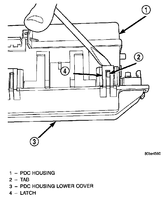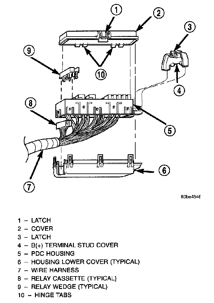 The Power Distribution Center (PDC) cover, the PDC housing lower cover, the PDC relay wedges, the PDC relay cassettes and the PDC B(+) terminal stud cover are available for service replacement. The PDC cover and B(+) terminal stud cover can be simply unlatched and removed from the PDC housing without the PDC being removed or disassembled. Service of the remaining PDC components requires that the PDC be removed from its mounting and disassembled. Refer to Wiring Repair procedures.