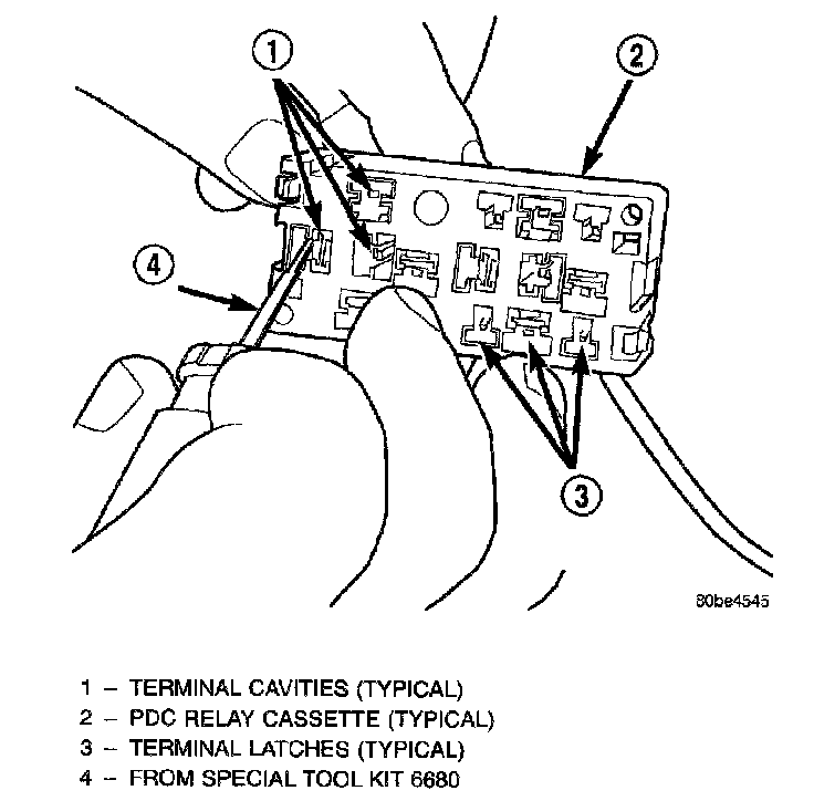 CAUTION: Proper care must be taken to be certain that the wiring and terminals from the faulty PDC relay cassette are installed in the correct terminal cavities of the replacement relay cassette. To prevent mistakes it is recommended that the wiring and terminals be removed from the faulty relay cassette one cavity at a time, repaired or spliced as necessary, then installed securely into the correct cavity of the replacement relay cassette. If you are not absolutely certain into which cavity a terminal should be installed, refer to Power Distribution circuit diagrams covering the PDC.