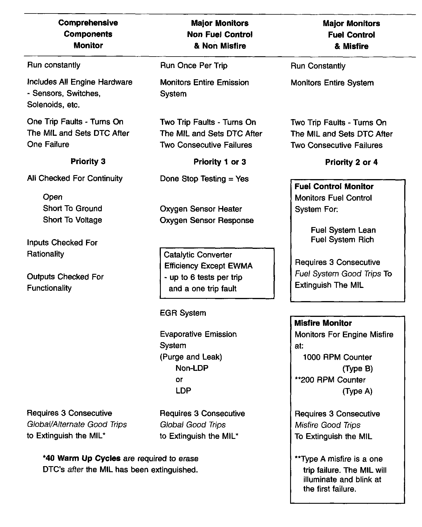 The above table summarizes the various OBDII monitors operation.