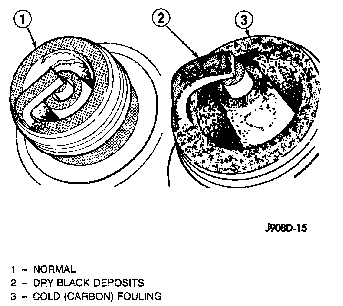 Cold fouling is sometimes referred to as carbon fouling. The deposits that cause cold fouling are basically carbon. A dry, black deposit on one or two plugs in a set may be caused by sticking valves or defective spark plug cables. Cold (carbon) fouling of the entire set of spark plugs may be caused by a clogged air cleaner element or repeated short operating times (short trips).