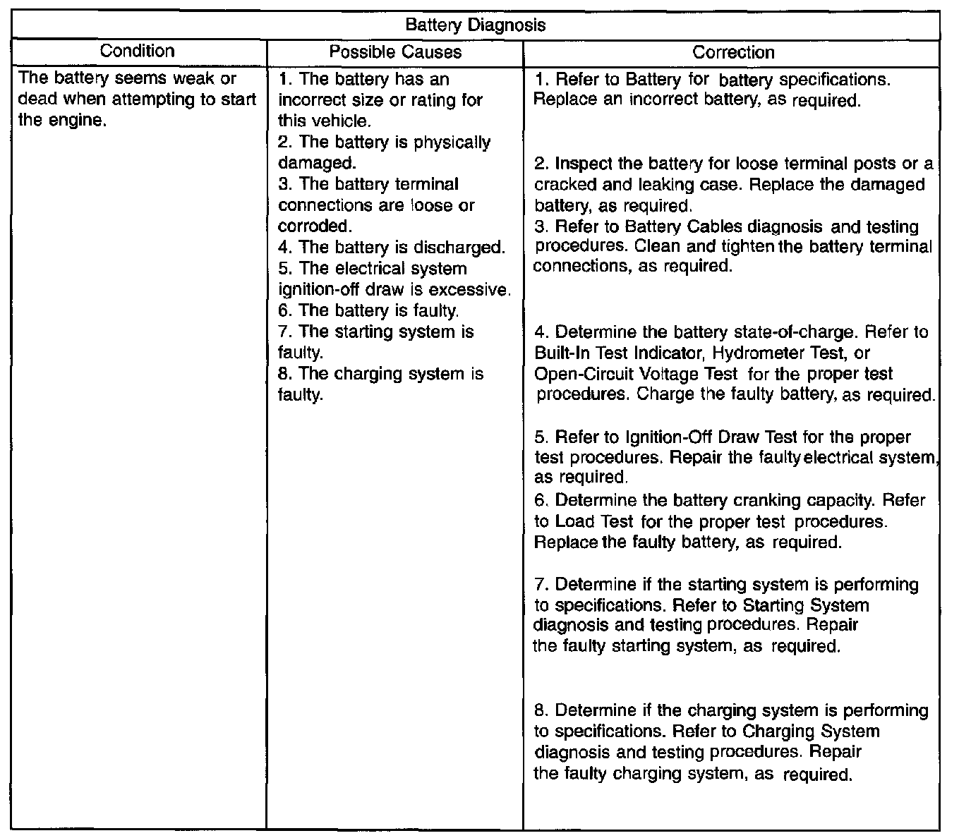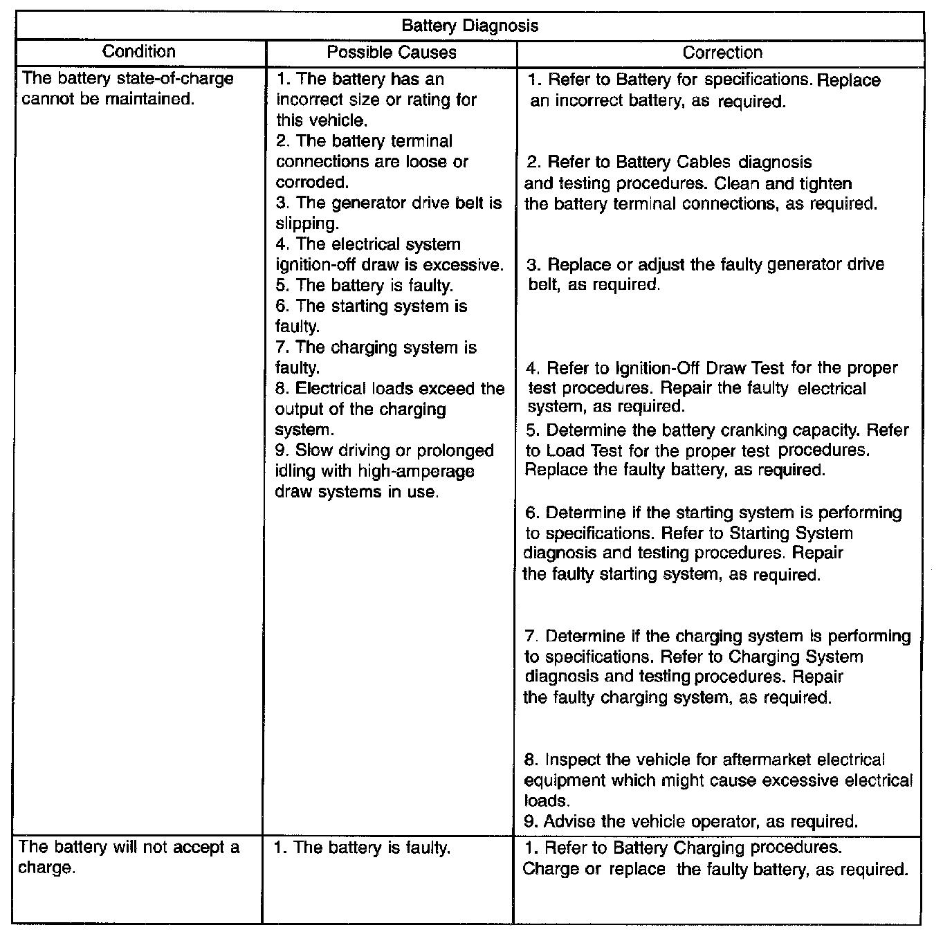 A battery that will not accept a charge is faulty, and must be replaced. Further testing is not required. A fully-charged battery must be load tested to determine its cranking capacity. A battery that is fully-charged, but does not pass the load test, is faulty and must be replaced.