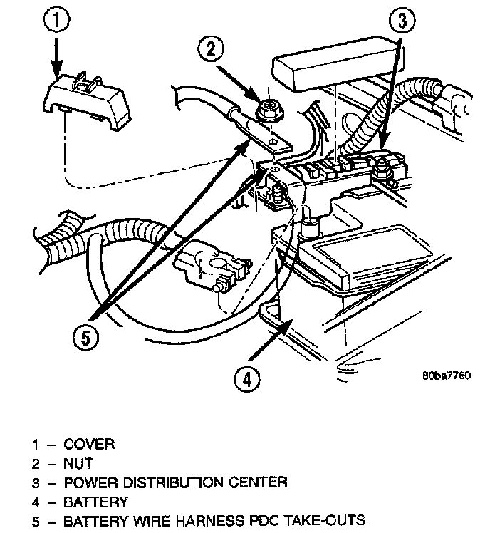6. Install and tighten the nut that secures the eyelet of the battery wire harness PDC take outs to the B(+) terminal stud. Tighten the nut to 10.8 Nm (95 in. lbs.).