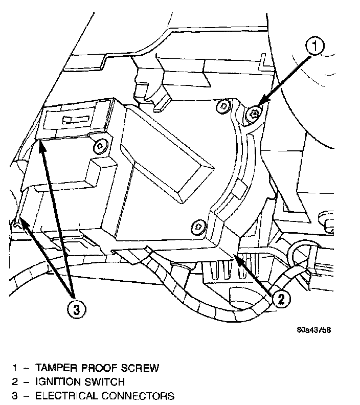 3. Remove ignition switch mounting screw. Use tamper proof torx bit (Snap-On (R) SDMTR10 or equivalent) to remove the screw.