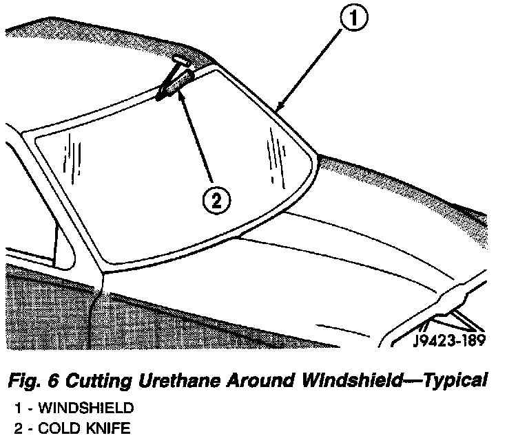 5. Using a cold knife, cut the urethane around the perimeter of the windshield (Fig. 6).