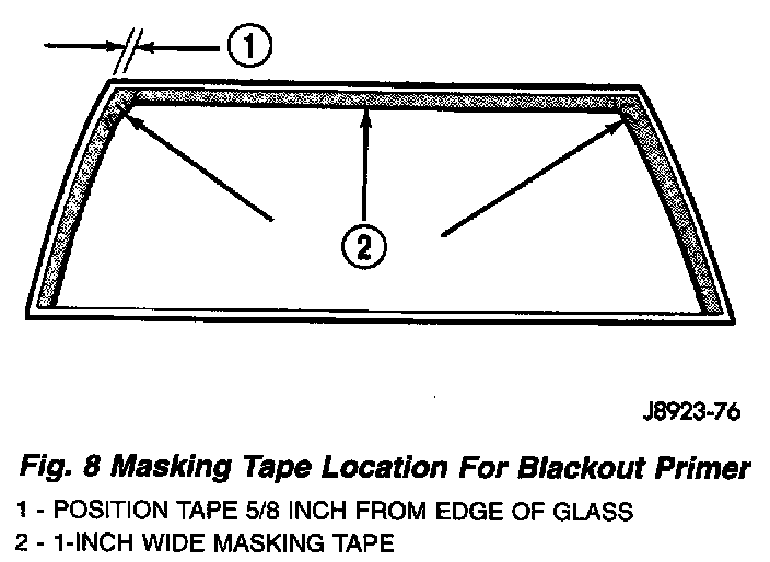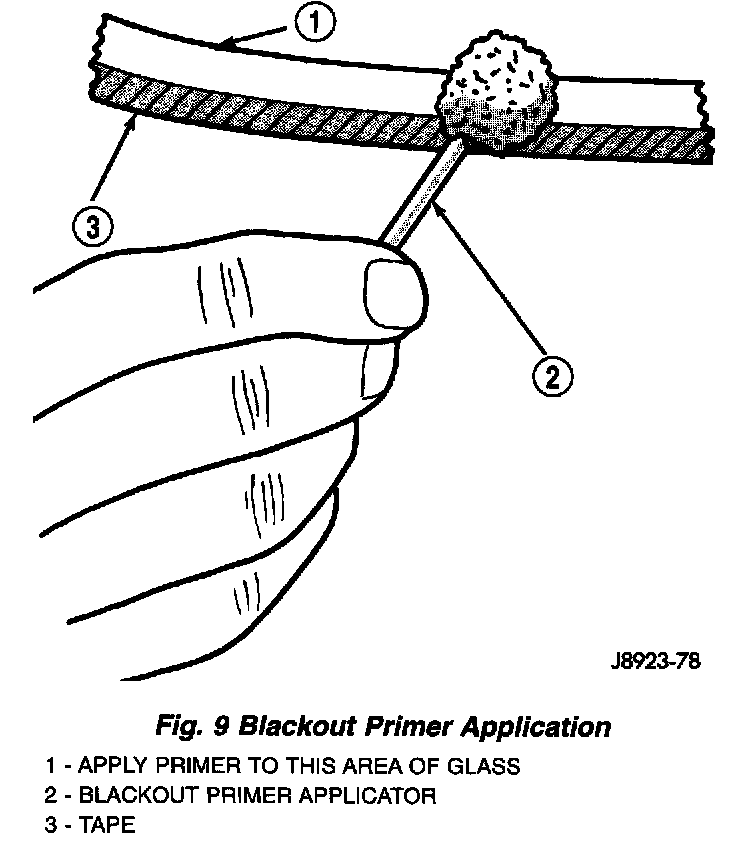 - Thoroughly mix and apply glass blackout primer to the 16 mm (5/8 in) surface area around the interior side of the glass (Fig. 9).